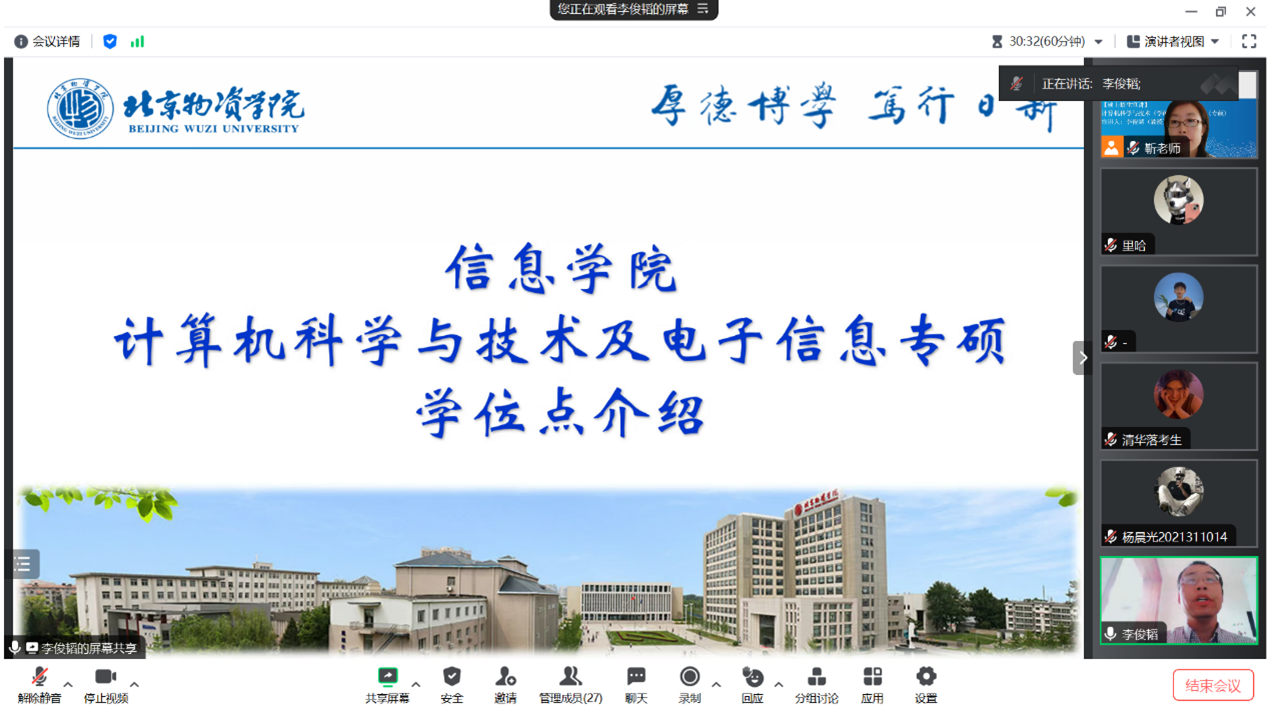 为进一步加强公司计算机科学与技术学硕和电子信息专硕招生宣传,bevictor伟德于2023年9月23日9点面向校内外考生举行2024年硕士招生线上宣讲会,电子信息专硕点负责人李俊韬教授、执行主任丁毅和靳军老师,以及部分考生参加了此次会议。