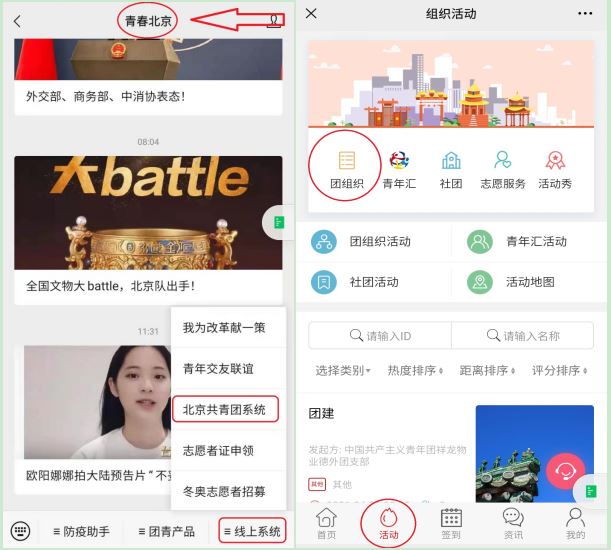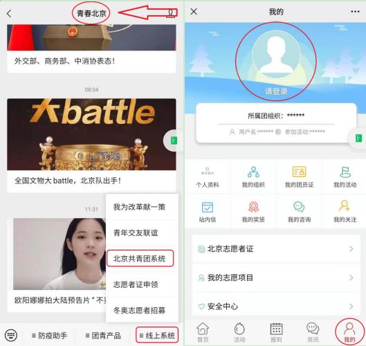 (一)第一步:进入“青春北京”公众号→点击“线上系统”→点击“北京共青团系统”→点击“我的”→点击“登录”(如无法登陆可找回密码或进行账号申诉,申诉网址)