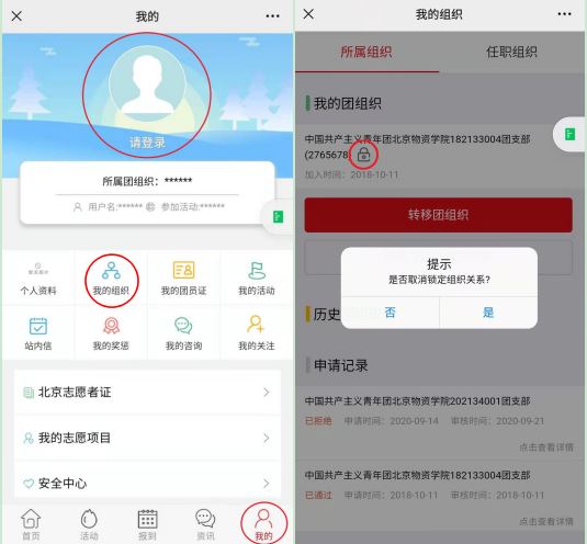 (二)第二步:点击“我的组织”→解除组织关系锁定