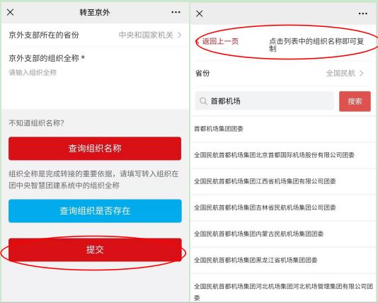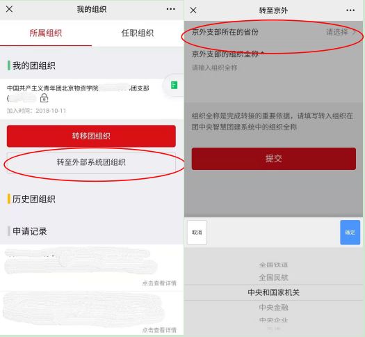 (1)点击“转至外部系统团组织”→在“京外支部所在省份”处选择对应省份或国家机关企业→查询组织全称并复制→粘贴全称至“京外支部的组织全称”→提交