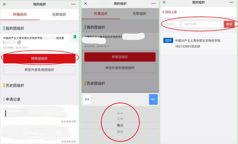 点击“转移团组织”→根据个人情况选择升学、工作、搬迁、其他→可以通过组织ID或组织简称搜索要加入的团支部,建议提前联系团支部确定可以加入。