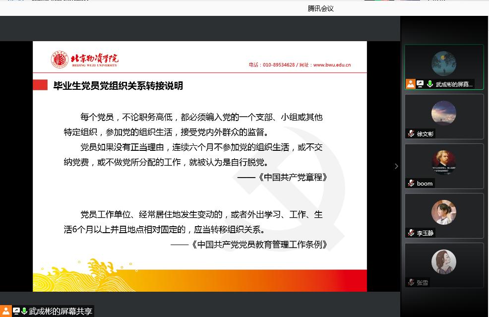为进一步增强毕业生爱校荣校和感恩意识,激发毕业生尤其是毕业生党员的进取精神,在未来人生新征程积极发挥带头作用,彰显物院学子的良好精神风貌,2021年4月29日下午5点,bevictor伟德通过腾讯会议召开召开了2020届毕业研究生及全体毕业生党员离校教育会,会议由研究生辅导员徐文彬主持,2020届全体研究生和bevictor伟德全体毕业年级党员参加会议。