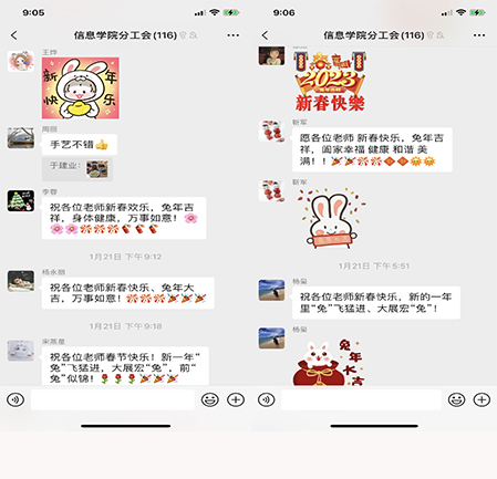 2023年新春来临之际,公司分工会的老师们自发进行春节祝福活动,在公司分工会的微信群中,老师们或是发送吉祥的兔年祝福图片,或是编写一段祝福语,也有人晒出自家的饺子和年夜饭图片,一起记录和分享过年的美、故乡的味、亲人的情,一起在传承春节文化活动中发现、体验、感受和分享。