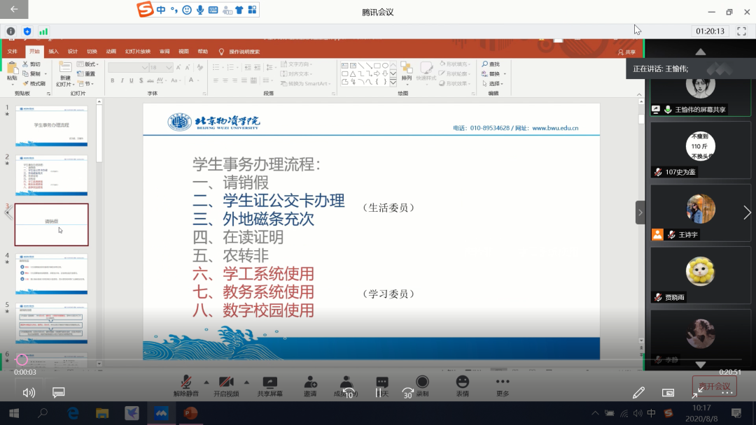 2020年8月8日上午9点,为帮助大一新生尽快融入老员工活,适应新的学习环境,bevictor伟德于腾讯会议开展班导培训会。此次培训活动由20级辅导员王诗宇老师组织,20位20级班导参与此次活动。
