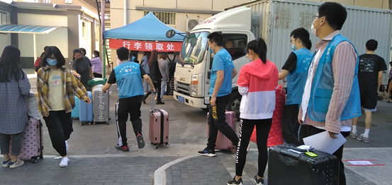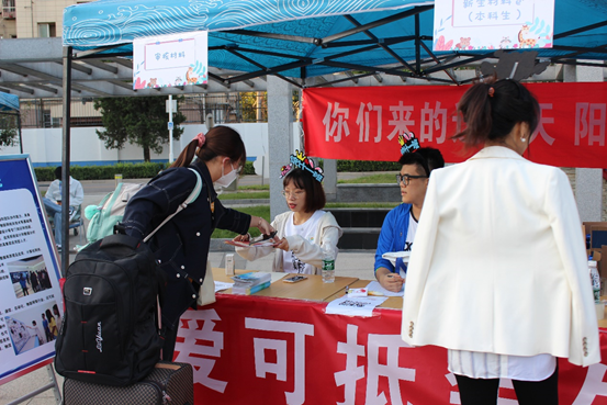 朝阳初生,各位迎新人员们已然各就各位,进行着准备工作,等待着新生的到来。