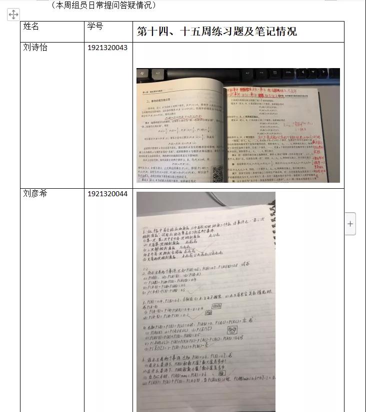 从材料来看,小组学习形式多种多样:包括线上网课形式、微信聊天记录、表格展示练习题笔记等,对学习概率论本身真实有效,组长认真负责,调动组员气氛,组员积极参与学习活动,从材料给出的作业效果来看,取得了不错的成绩。过程性材料:(照片2-3张)能够真实反映学习状态,忌摆拍的照片