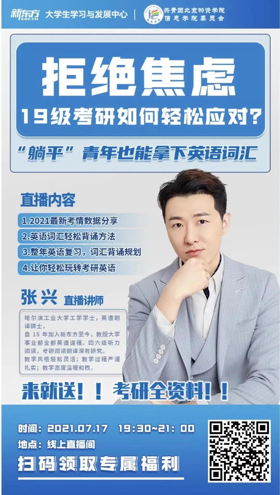 张兴老师:哈尔滨工业大学工学学士,英语翻译硕士,自15年加入新东方至今,教授大学事业部全部英语课程。四六级听力阅读,考研阅读翻译深有研究。教学特点:方式轻松灵活;内容严谨扎实;态度温暖和煦。大家可以扫描海报上方的二维码进入直播间参与考研讲座或直接点击链接即可参与讲座链接:https://z311086.weixin.xdf.cn/wechat/live/detail?id=74259