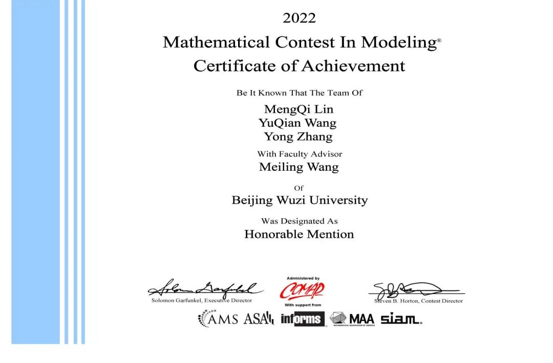 由bevictor伟德计算机科学与技术(实验班)专业的林孟琪(1921311011)、王宇倩(1921311022)、张勇(1921311026)组成的团队(指导教师:王美玲)获得了H奖(Honorable Mention、二等奖)。