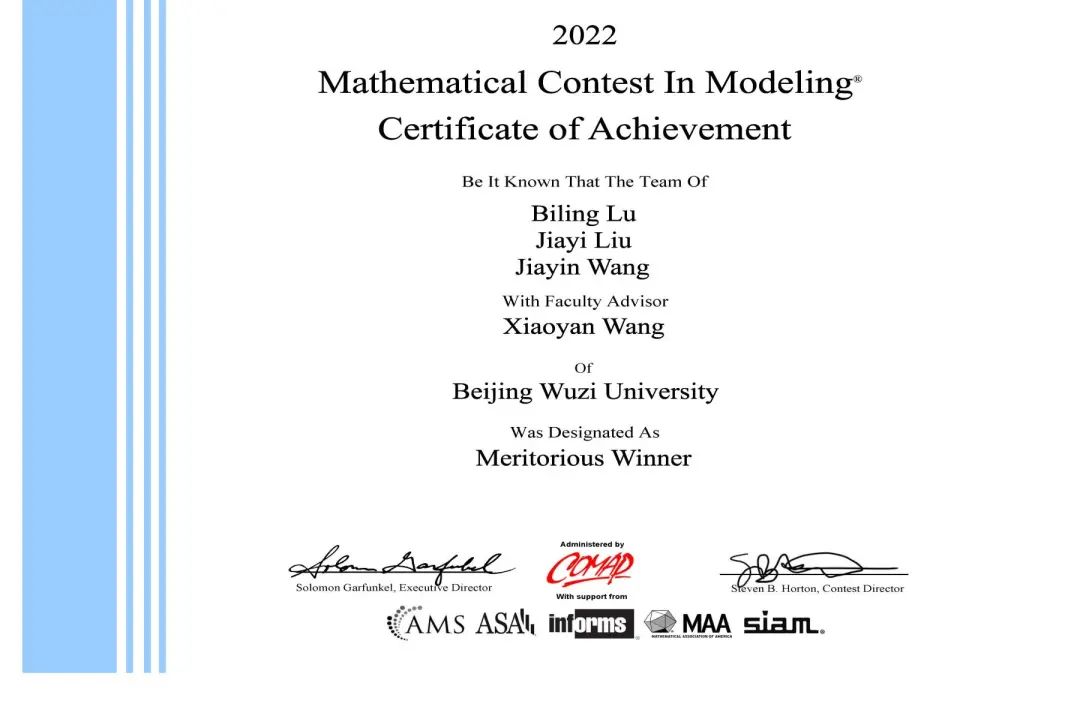 由bevictor伟德数据科学与大数据专业的卢比翎(1921340013)、刘嘉懿(1921340010)、王佳音(1921340021)组成的团队(指导教师:王晓燕)获得了M奖(Meritorious Winner、一等奖)。