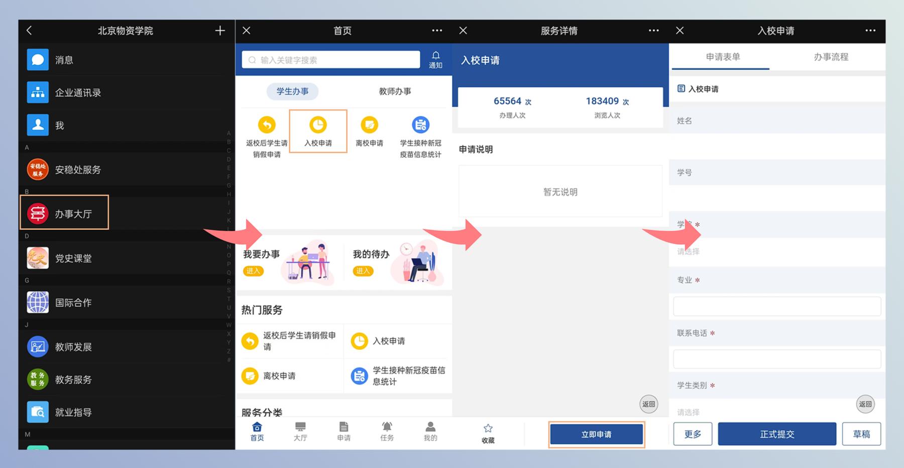 通过“离校申请”离校后的员工返校,须提前在公司微信“办事大厅”中“入校申请”模块提交入校申请,经批准后方可入校。