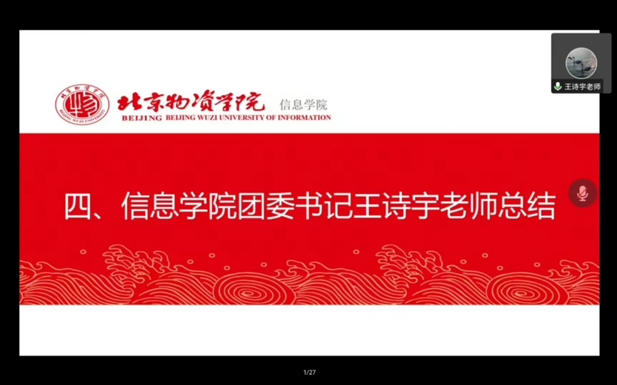轮值主席牛梦竹对工作进行总结,其分管的两个部门在校团委的指导下均圆满完成了任务,她表示受疫情影响部分活动展开的时间较短或是无法举办,将根据下学期形势决定是否延迟举办,并期望如若活动能够举办希望在此基础上进行创新。