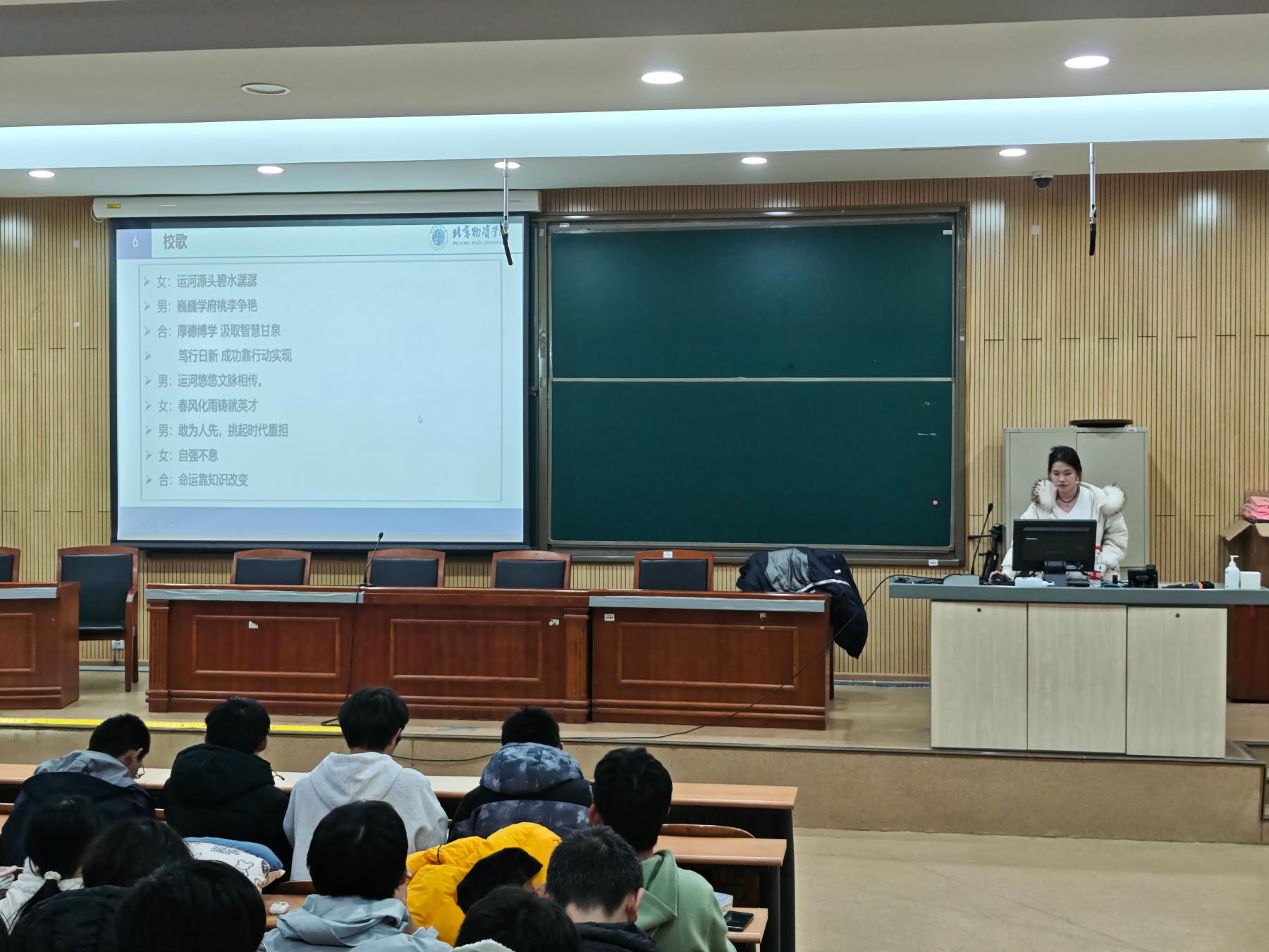 随后,为进一步增强新生们对校本文化的认同感和归属感,公司文体部员工骨干裘可馨受邀带领新生学唱校歌。裘可馨通过现场示范、逐句教唱、分组合唱等多种方式组织教学,同时鼓励同学们要透过校歌感悟其背后充沛的物院力量。伴随着昂扬动听、节奏明快的校歌旋律,全体新生在悠扬的歌声中领略美丽的校园,牢记厚德博学、笃行日新的校训,在激昂奋进的旋律里,唱出了物院学子的骄傲与自豪,也展现了新时代青年斗志昂扬、锐意进取的精神风貌。