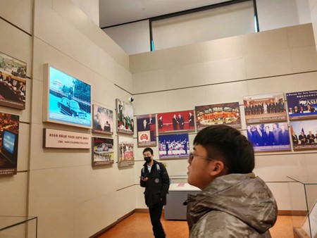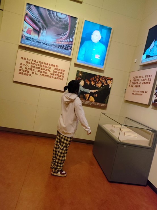 馆区分为“古代中国”、“复兴之路”、“专题陈列”等板块展馆。展品中不仅有乾隆南巡长卷数字展、中国书法、瓷器、玉器、青铜等传统展藏,还有非洲雕刻艺术精品展、捐赠作品展、外交受赠礼品展等充满现代元素的展品。展厅一楼正中心陈列着中国共产党建设新中国的艺术展品,给了同学们极大的视觉盛宴。同学们在各个展区都认真参观、努力学习,部分同学还通过听语音解说的方式了解某些文物背后的历史。在巧妙绝伦的展品面前,参观人员不由地感叹古代人民匠心精神,不禁心生民族自豪感。