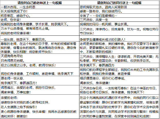 本次活动围绕“弘扬高尚师德,潜心立德树人”的主题,营造氛围,弘扬师德,感念师恩。“2023年是我国大陆地区的第(39)个教师节”;“《中华人民共和国教师法》自(1994年1月1日)起施行”;“中国近代史上,(蔡元培)第一次明确将美育列入教育方针”; “(.张桂梅)老师建立了全国唯一一所免费女高,专门供贫困家庭的女孩读书”……一个个问题紧密配合活动主题,让老师们对教师节的相关内容有更深入的了解。本次活动中还特别设置了两个开放题:“对自己的老师送上一句祝福“以及”对自己的同行送上一句祝福“,在特殊的日子里,每位老师向照亮我们道路的前辈、与自己并肩前行的同事表达敬意,送上祝福。