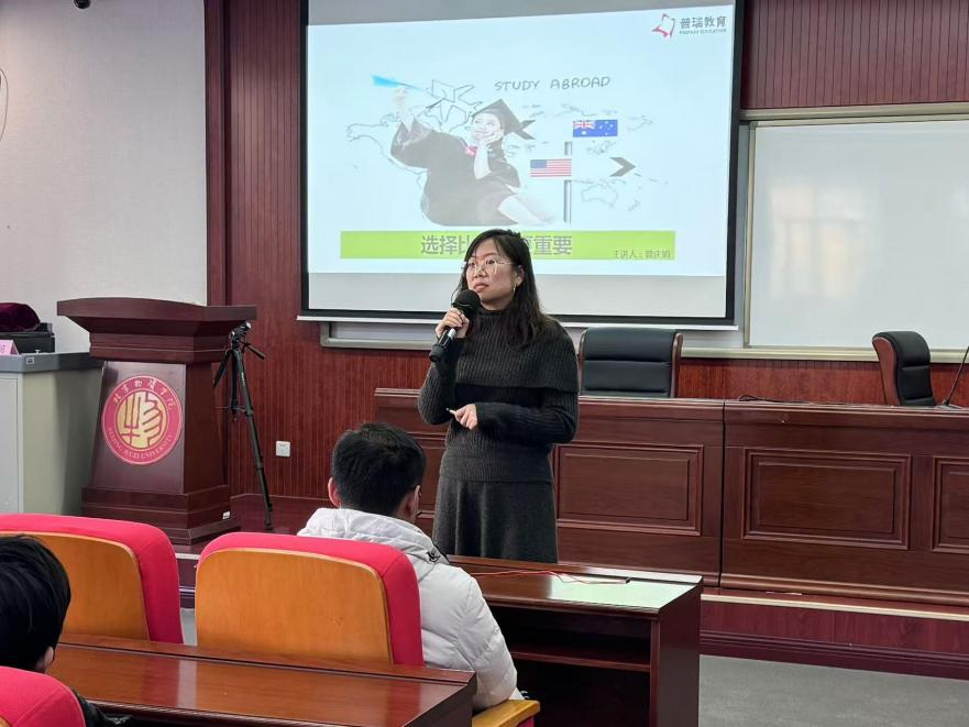 首先,曾庆娟结合时事政策及最新统计数据向与会人员全面介绍了当前的国内外升学形势,并从申请流程、申请标准、录取难度等多个维度深刻剖析了国内外升学的异同点。随后,她又针对同学们的求学意向,就英国、美国、澳洲、爱尔兰等热门留学区域的公司产品体系及人才培养规格进行了细致阐述。最后,她向正处于留学规划初期的同学们提出了三点宝贵建议。一是要做好学业规划。充分利用碎片化时间做好知识积累,力求在雅思、托福、GRE等各类语言考试及标准化考试中取得优异成绩,为留学之路扫清障碍。二是要制定合理目标。做好信息采集及分析工作,充分了解自身及目标院校特征,选择高适配性院校。三是要保持良好心态。留学申请的过程中难免会经历挫折与困难,在此过程中务必要坚定理想信念,脚踏实地,不断提升综合能力。
