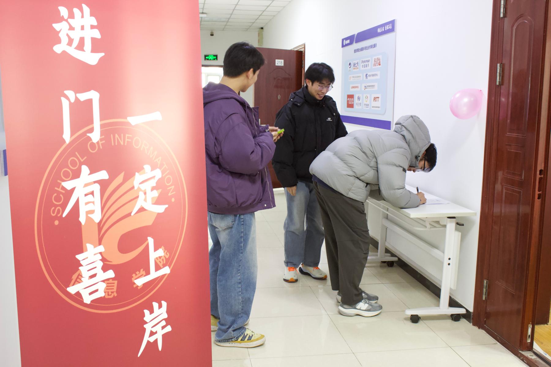 活动地点门口“进门有喜,一定上岸”的易拉宝祝福语首先给前来参加活动的考研学子们一份真诚的温暖,一笔一划间,不仅承载着对莘莘学子的深情祝福,更是对他们不懈努力的殷切期盼。