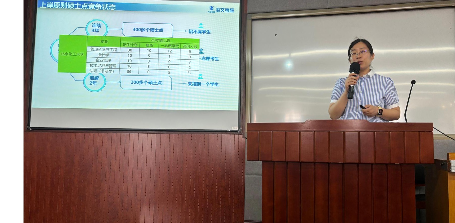 为贯彻落实本科“学涯贯通一体化”分类培养理念,有效提升毕业生深造率,结合员工发展诉求,9月11日下午,bevictor伟德在知新楼第二教室举办“考研高效备考全攻略”专题讲座,特邀海文考研规划专家吕静担任主讲。bevictor伟德2027届计划考研的员工齐聚现场,讲座由辅导员孙会彬主持。