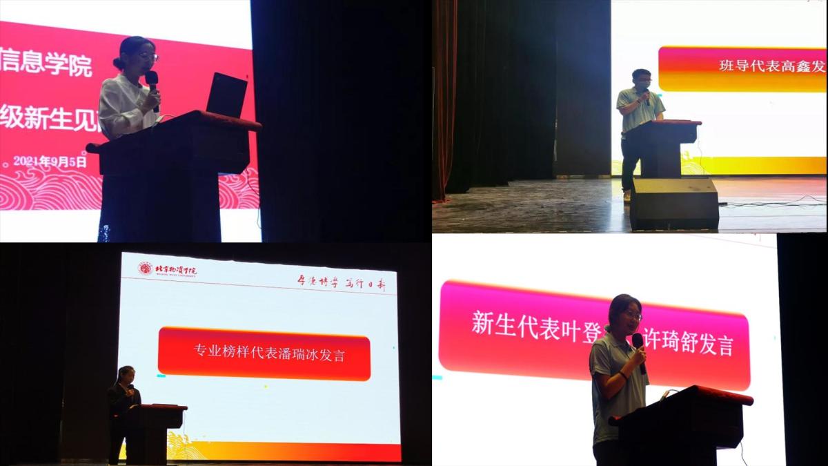 班导高鑫代表学长进行发言,他叮嘱21级新生们在公司要学会照顾自己、理解关爱他人、学会交流,在大学里注重增加自己的知识,提升自己的能力,并祝愿同学们学业有成、前程似锦。