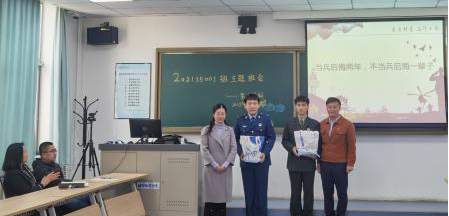 班会第一项议程是为两位退役老员工士兵举行入班仪式。参军退伍复学至班级的赵翊普和屈航同学为同学们做了“携笔从戎,青春无悔”的主题宣讲,他们分享了丰富多彩的部队生活,帮助同学们更全面地了解了真实的军旅生活,鼓舞着同学们将爱国之心转化为报国之行。