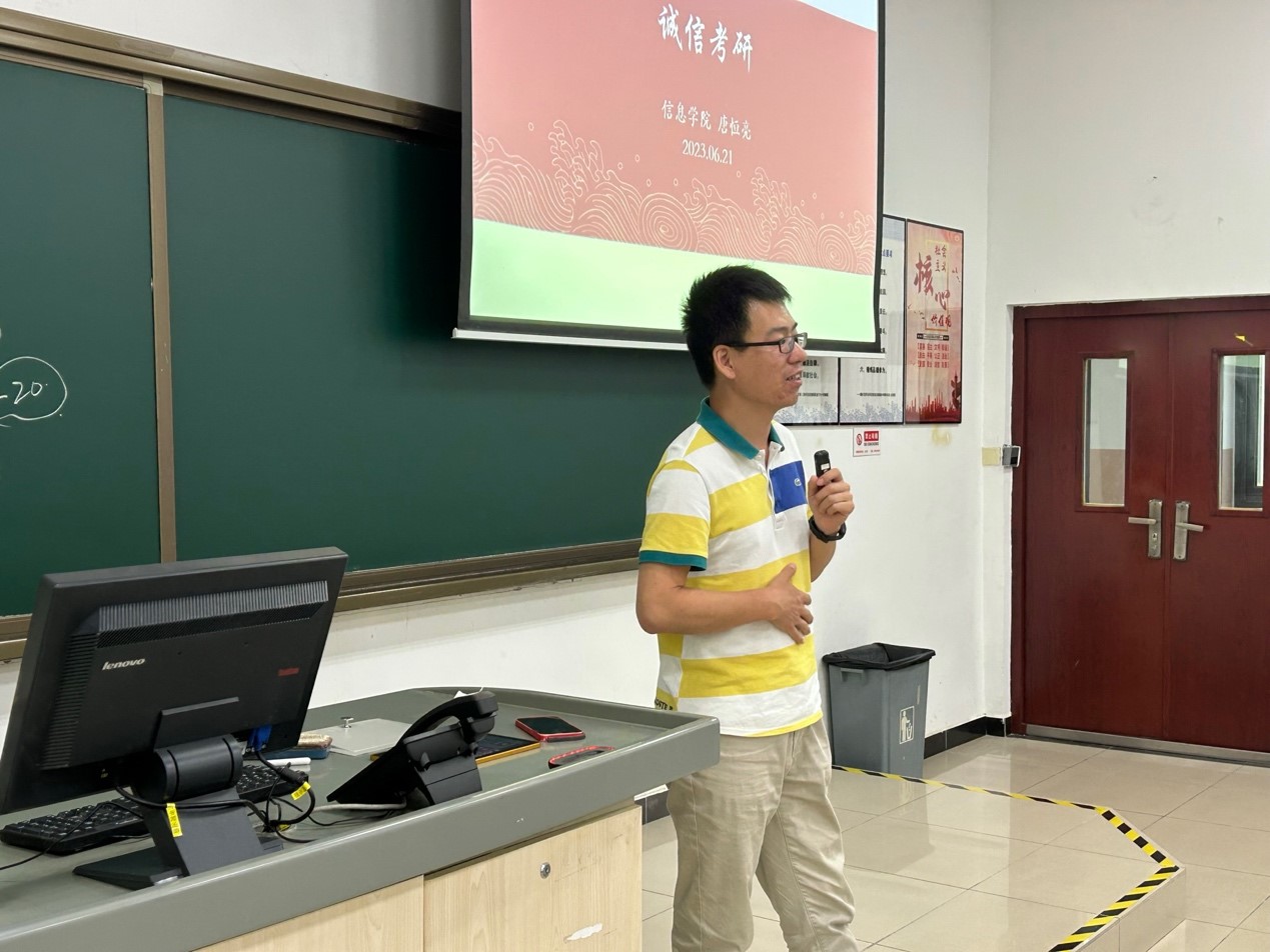 接着,唐恒亮老师从学术诚信、校学位点建设、院学位点建设、报考与准备、调剂五个方面对考研政策进行解析,并重点对考试准备以及调剂两方面进行了细致讲解,他提醒同学们不要盲目追求名校,要结合自身实际做出科学的选择。